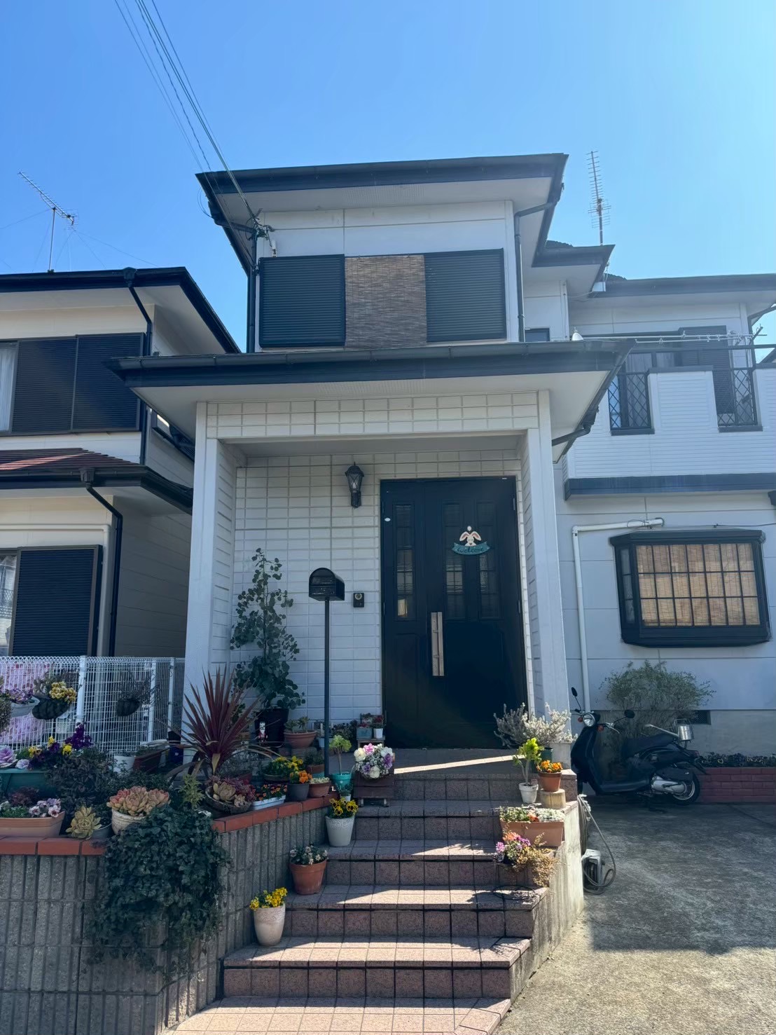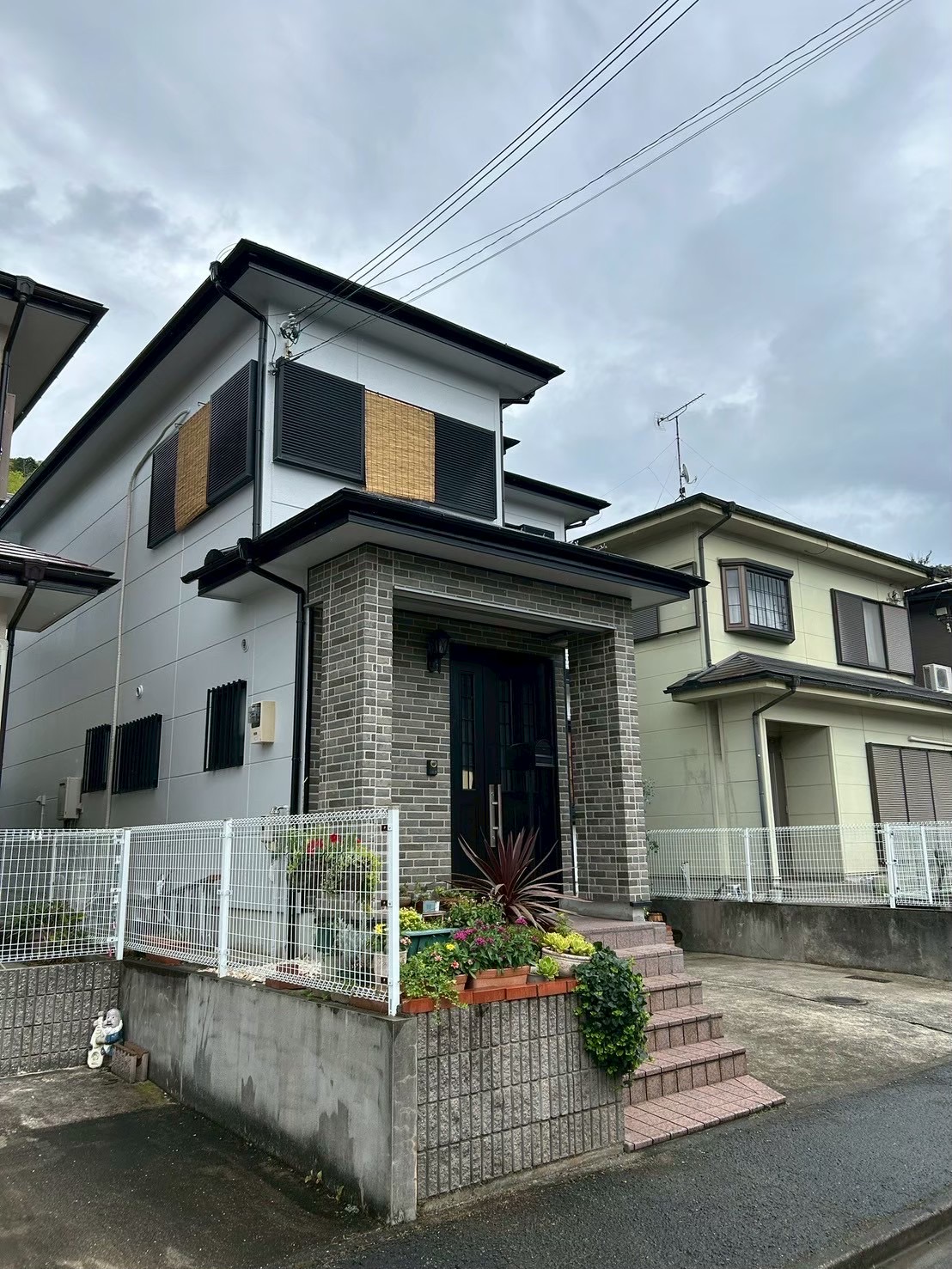 外壁は落ち着いたホワイト系カラー(日本ペイントパーフェクトトップND-400)に塗り替え、住宅全体が明るく上品な印象に。
